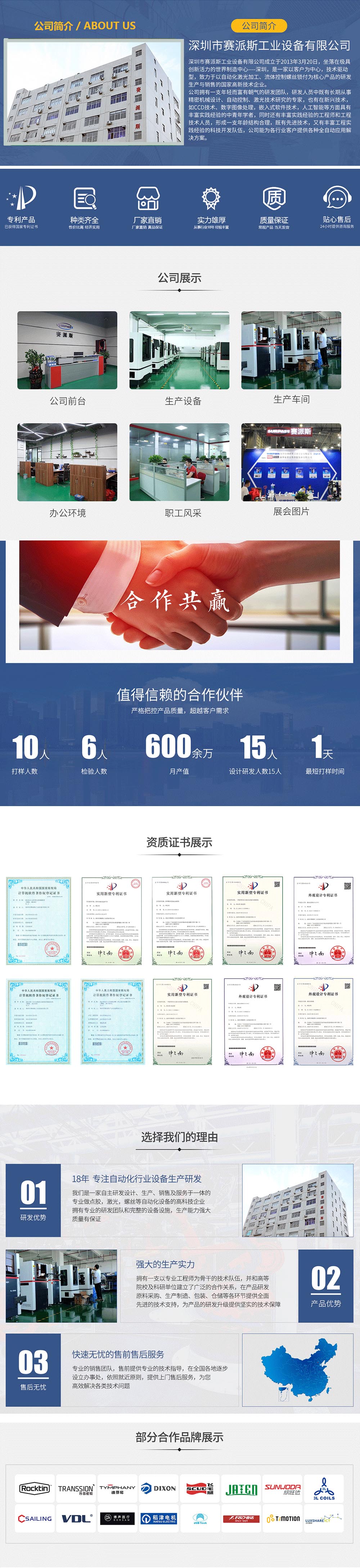 深圳市賽派斯工業設備有限公司成立于2013年3月20日,坐落在極具創新活力的世界制造中心----深圳,是一家以客戶為中心,技術驅動型,致力于以自動化激光加工、流體控制,螺絲鎖付為核心產品的研發、生產與銷售的國家高新技術企業。