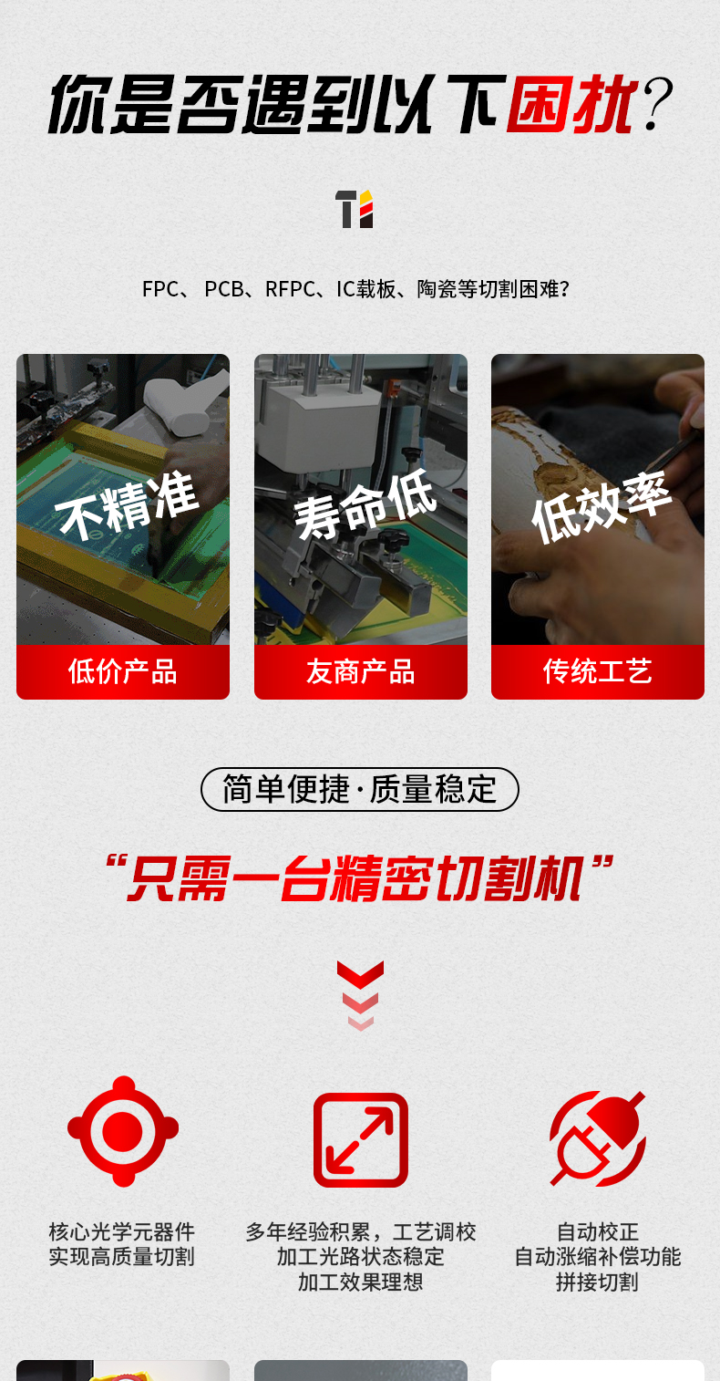 快速拼板生產的PCB分割成獨立電路板,加工LTCC,加工半固化片,在FR4上鉆孔、鉆微孔、激光直接成型電路圖形等。紫外激光與其他加工方式或其他激光相比,切割邊緣更整齊,外形尺寸精度更高產品加工模式無間隙切換,只需點擊軟件菜單導入新加工項目即可。